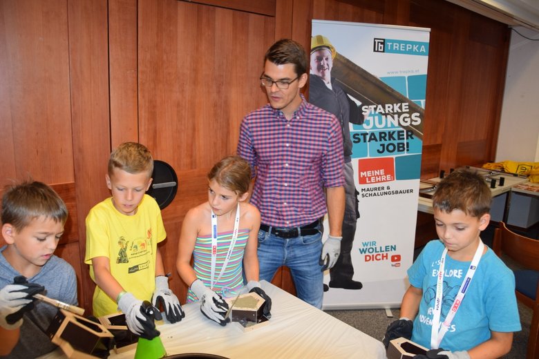 Von 15. bis 19. Juli fand heuer die bereits 5. Kinderbusinessweek im WIFI St.Pölten statt. Während des einwöchigen Ferienbetreuungsprojekts bot die Landesinnung Bau gemeinsam mit Trepka einen von 85 spannenden Workshops an. Kinder im Alter von 7 bis 14 Jahren erhielten praxisnahe Einblicke ins Wirtschaftsleben und in die Berufsbilder am Bau im Speziellen. Dabei wurden nach einem Theorie-Teil Häuser mit Miniziegel gebaut. Danach wurden sogar kleine Häuschen mittels selbst gebauter Schalungen von den Kindern betoniert.